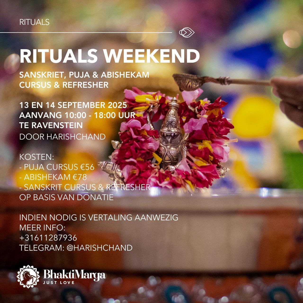 RITUELEN WEEKEND (13/14 september)- Sanskriet, Puja en Abishekam cursus en opfriscursus. INHOUD: Zaterdag 13e - Sanskriet Cursus Zondag 14e - Puja & Abishekam - Japa wandeling op beide dagen- OM Chanten op zaterdag + Optioneel:- kirtan/heiligen films op zaterdagavond- groeps AKY oefening op zondagochtend VEREISTEN: Sanskriet en puja cursus iedereen kan deelnemen, toegewijden of nieuwkomers. […]